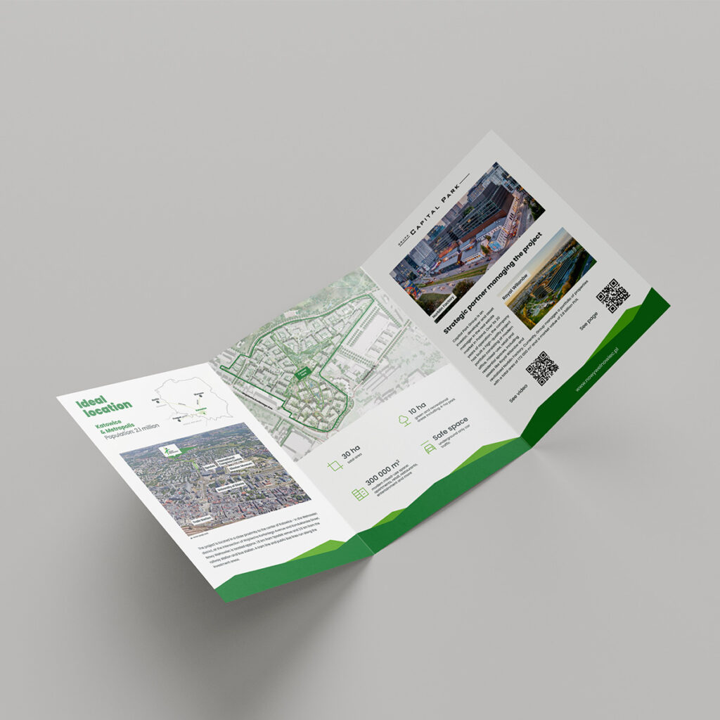 Przygotowaliśmy zestaw materiałów wizerunkowych i sprzedażowych, w tym teczki, wizytówki, torby, papier firmowy, folder oraz ulotki. Wszystkie elementy zostały zaprojektowane w oparciu o istniejącą identyfikację wizualną projektu, zachowując spójność, estetykę i czytelność przekazu.