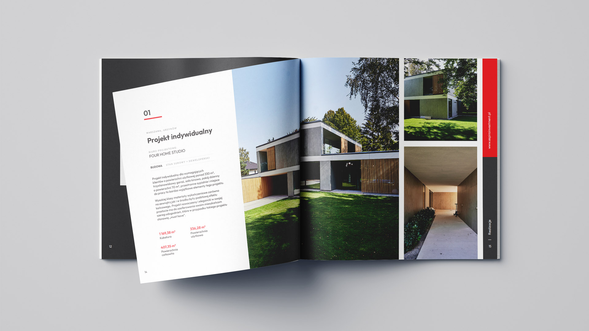 Równolegle przygotowaliśmy folder z realizacjami, który w spójny sposób prezentuje dotychczasowe projekty i stanowi uzupełnienie komunikacji online. Skupiliśmy się na logicznej strukturze treści i klarownej architekturze informacji, tak aby użytkownik mógł szybko zrozumieć proces i zakres usług.